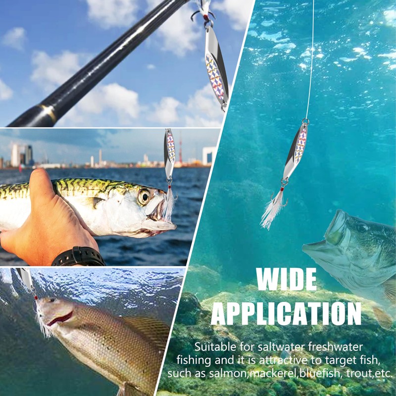- Wide Application - The fishing spoon spinner lure can be used for both freshwater and seawater fishing, and is widely used in various fish species, such as salmon, steelhead, mackerel, trout, bluefish, rainbow trout, bluegill, pike, grouper, sunfish, rock bass, bigmouth bass, yellow bass, striped bass, musk bass, etc.