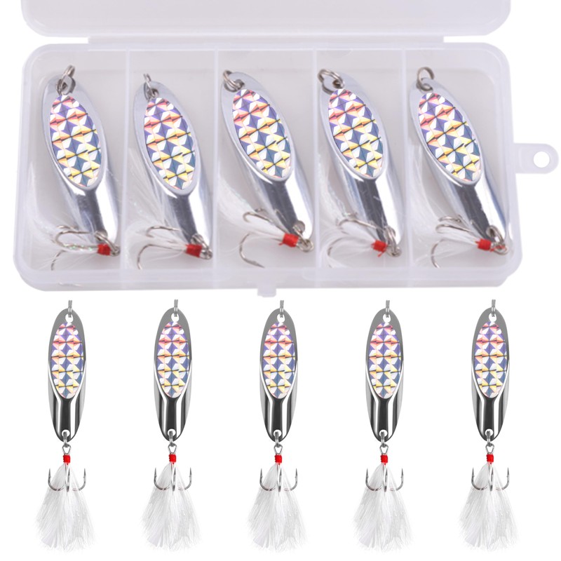 - Fishing Spoon Lures Kit - 5 fishing spoon lures in a reusable high-quality plastic box. Available in 6 sizes: 1/5 oz, 1/4oz, 3/8oz, 1/2oz, 3/4oz, 1 oz. This fishing spoon lure is definitely an essential lure for every fisherman's toolbox.