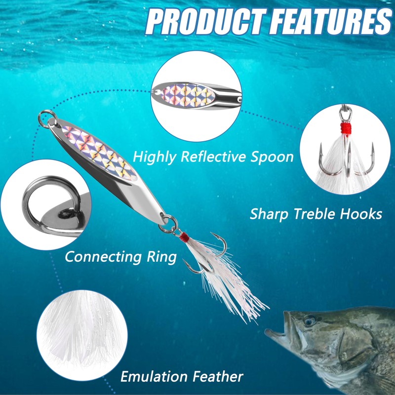 - Sharp Treble Hook - This spoon spinner lure is equipped with high carbon steel treble hooks that are strong and sharp, corrosion-resistant and durable, and have great penetrating power, helping to hold the fish firmly in the fight. Feathers on the treble hooks increase the flowing movement underwater, further attracting the target fish.