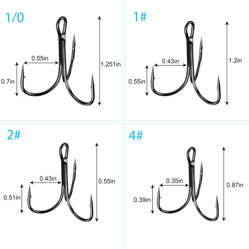 - ★HIGH STRENGTH - Treble fishing hooks made of high carbon steel with black nikel coating, light-weight , anti-rust and ultra strength. Fit for freshwater or saltwater Fishing