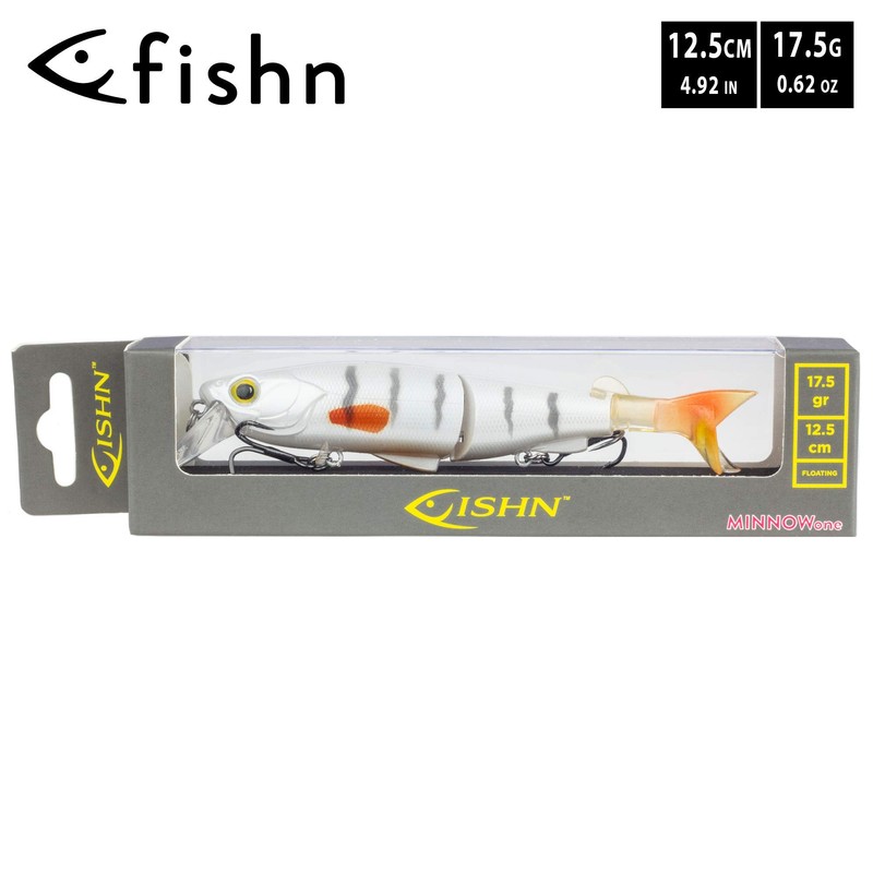 Der MinnowOne von FISHN ist ein sehr fangfähiger Swimbait - ideal für Raubfische wie Hecht, Zander Barsch und Forelle. Er besteht aus einem harten Körper und einem weichen Gummischwanz. Neben dem realistischem Fisch-Design und den großen realistischen 3D Augen besitzt der Kunstköder auch stabile und sehr scharfe Drillingshaken. Durch die Größe von 125mm ist der Köder eine optimale Beute für Raubfische. Durch das Gewicht von 17,5 Gramm können gute und gezielte Auswürfe erreicht werden. Die zweiteilige Struktur des Körpers lässt den Köder schon bei geringen Geschwindigkeiten real und lebendig durch das Wasser gleiten. Der Hybrid ist ein Floating Topwater Köder, dieser durch seine Tauchschaufel auch eine Lauftiefe von 1,5m erreichen kann. Variable Führung durch sinkende Lauftiefe des Köders sowie die schwimmende Aktion. Der Köder wird inklusive 2 Ersatt Schwanzflossen geliefert!