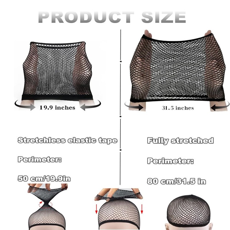 - Great elasticity: These mesh net wig caps with great elasticity, fitting different head sizes and hairstyles. For short hair, just wear it on the head to cover all real hair; For long hair, put the wig cap down to your neck, stretch backwards at your hairline, put all your hair in and make them flat