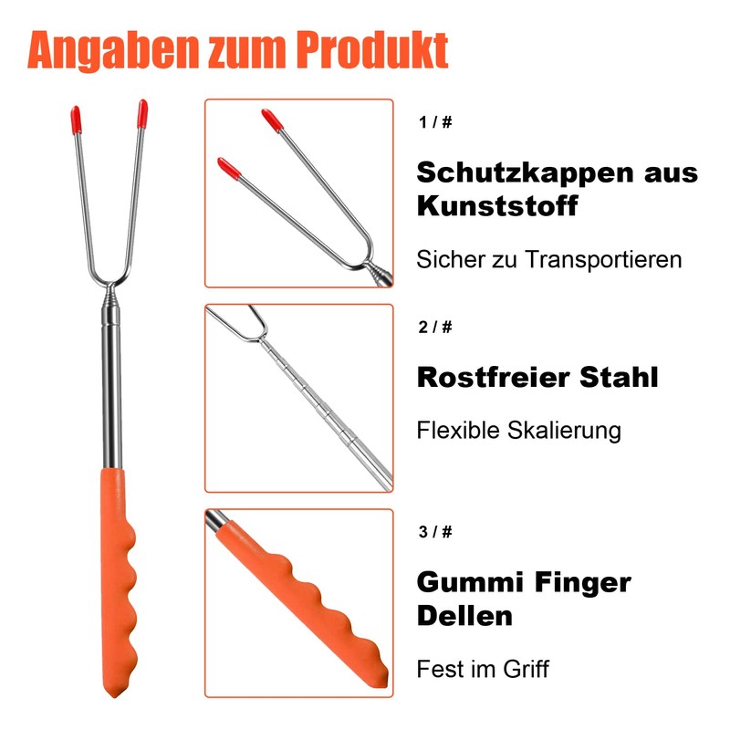 - New and improved robust design with a thick, slightly rotating handle - With a strong, easily retractable fork and a rotating axle with a finger movement to prevent marshmallow, hot dogs and sausages from cooking unevenly. The handles are larger and fit your grip perfectly and the fork head is thicker.