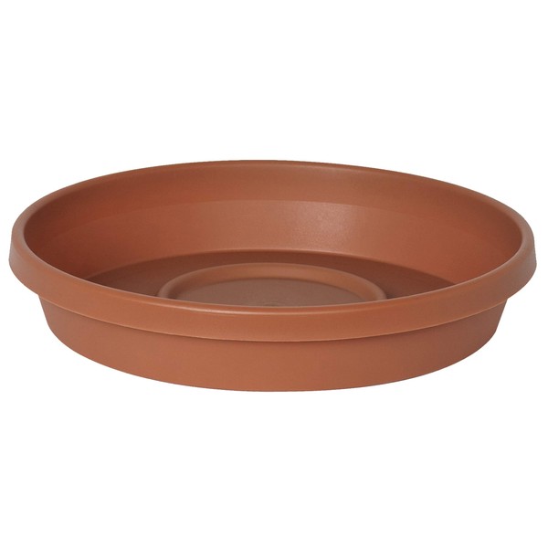 Color: Terracotta Clay. Material: Resin. Design: Traditional. Height: 1.7 in. Width: 10 in. Indoor and Outdoor. Shape: Round. Saucer Included. Durable lightweight resin. All-weather durability with UV protection. Textured finish looks like natural clay. Lightweight alternative to clay or ceramic. 100% recyclable. Matching pot sold separately #7237886.