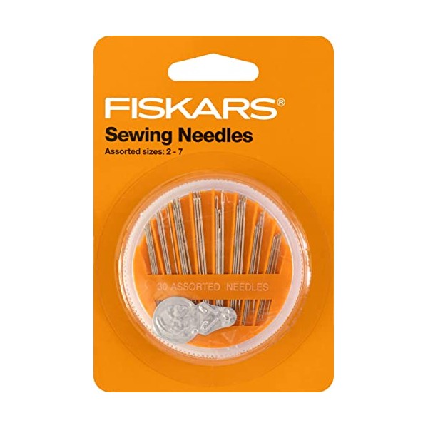 - Fiskars Assorted Sewing Needle contains 30 assorted needles and a needle threader, all neatly stored in a round compact