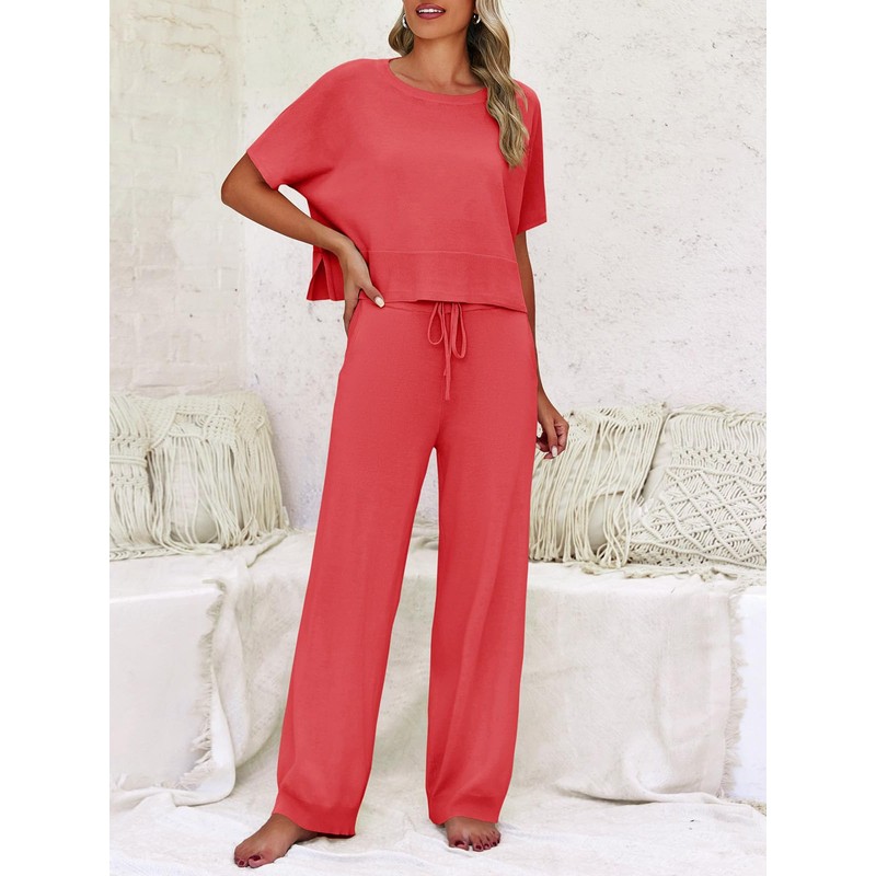 - Knit short sleeve crop top with side slits and a trendy split design: The crop top in this set features a stylish split design, adding a unique and modern twist to your look. The short sleeves provide a flattering silhouette, perfect for showcasing your personal style.