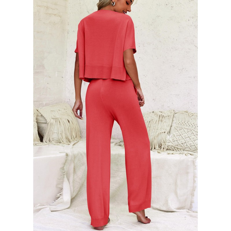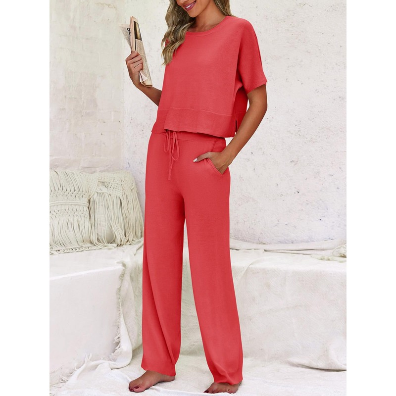 - High waist wide leg pants with a drawstring for a customizable fit: The wide leg pants in this set are designed with a high waist and a drawstring, allowing you to adjust the fit according to your preference. The wide leg design provides a relaxed and comfortable feel, while still maintaining a fashionable look.