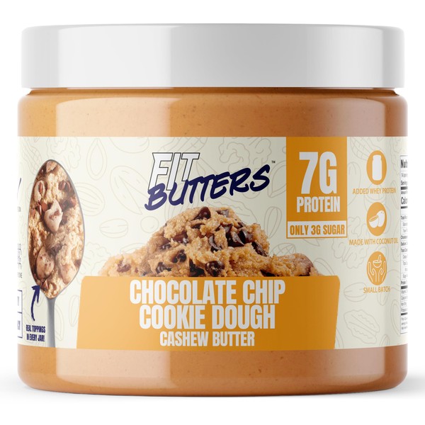 Fit Butters Chocolate Chip Cookie Dough Cashew Butter Spread - Added Protein and Coconut Oil, Low Carb, Low Sugar, Complete Protein Dessert Flavored Nut Butter