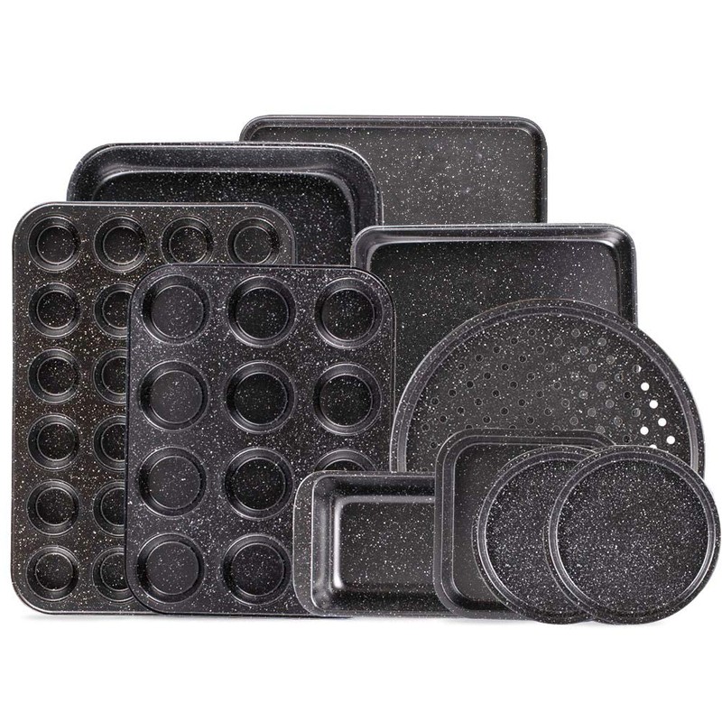 - 👍COMPLETE 10-PIECE BAKEWARE SET: The 10-PIECE BAKING SET includes complete high quality kitchenware for baking cake, loaf or muffins. Includes baking pan, pizza pan, small cookie sheet, 2 round pans, square pan, loaf pan, big cookie sheet, 12 & 24 cup muffin pans