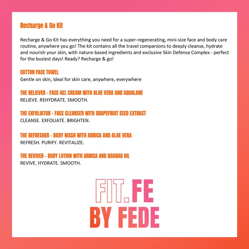 FIT.FE BY FEDE Recharge and Go Kit - 6 Pc Giftset - Skin Care Kit - Body Wash - Face Wash - Body Lotion - Face Moisturizer - Mini Towel - Bag - 6 Pc