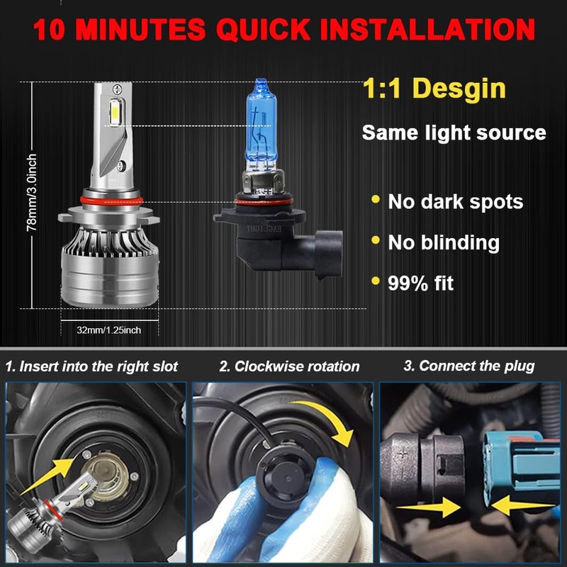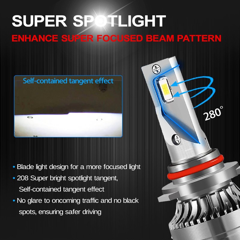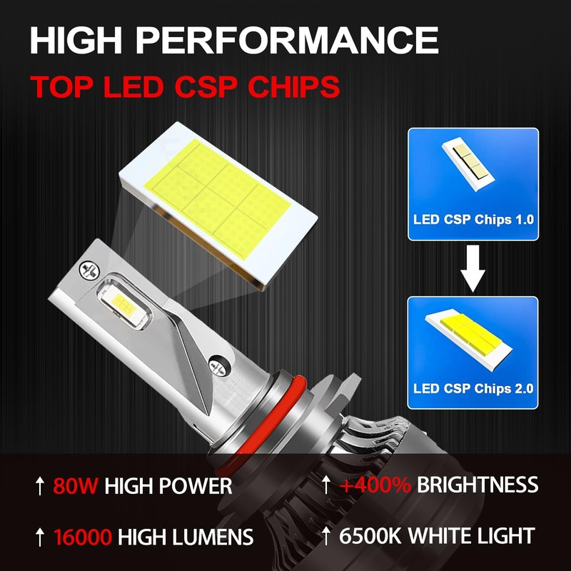 Super Bright CSP Chip, 80W, 16000LM per pair, 1200FT visibility, meaning Our headlight bulbs are brighter than many HID headlights and halogen bulbs while also consuming less energy. 400% brighter than your original halogen lamps.