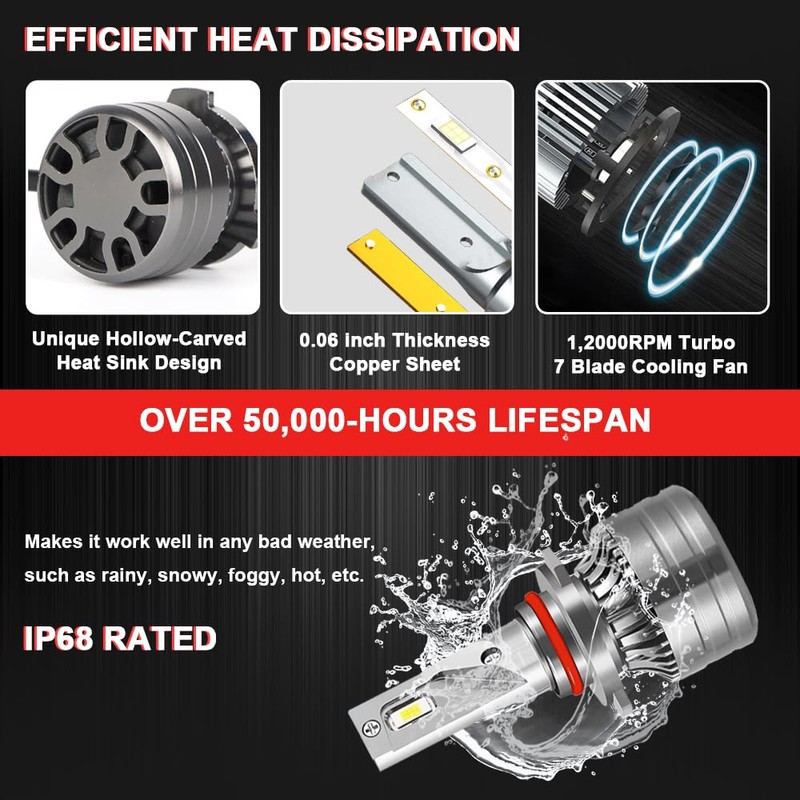- 【Over 5,0000 Hours Lifespan】- Our LED headlight bulbs are made with 6063 aviation aluminum that is hollow carved and has a unique heat sink design and 12000RPM turbo cool fan technology for better cooling. It ensures a longer lifespan of up to 50000 hours to give you peace of mind while driving.