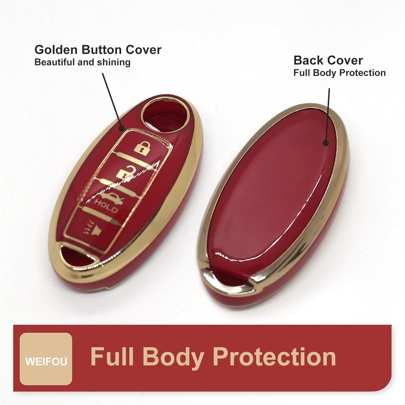 【Design】Fit for Nissan Luxury Car Key Fob Cover includes a premium keychain, Compatible with Nissan Quest X-trail 370Z GTR Patrol Cima Fuga Altima Armada Maxima Rogue Cube Pathfinder Sentra Juke Leaf Titan Teana etc. 4 Buttons keyless entry remote control. Please DOUBLE CHECK the appearance of the smart key fob referring to the 2nd picture.