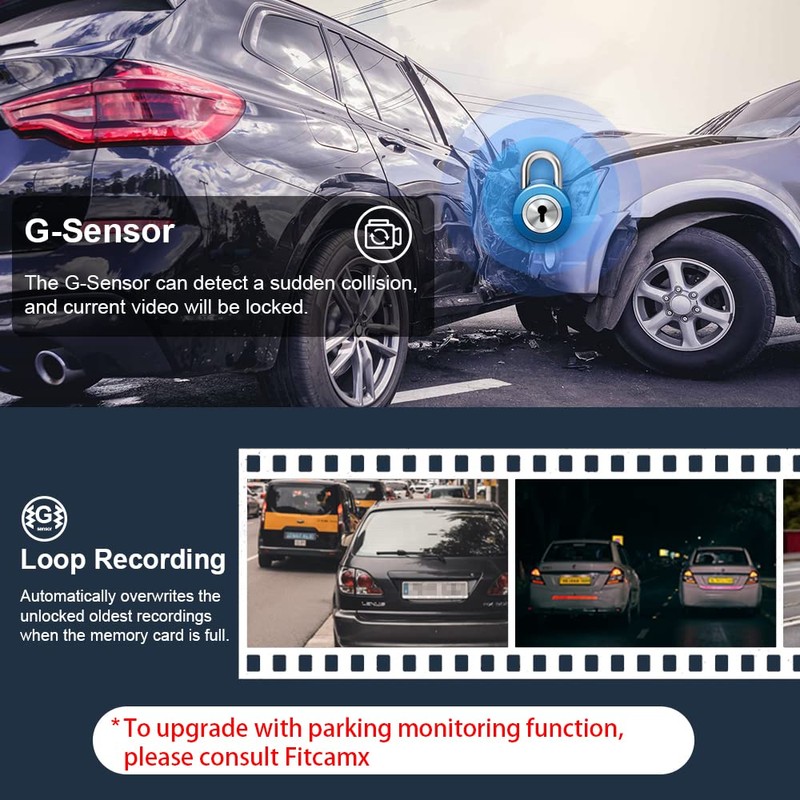 - 【Loop Recording & G-Sensor】Seamless loop recording will overwrite the oldest footage with new content when memory storage is full, contained 64GB card and support maximum 256GB. While G-Sensor function can detect a sudden collision, save the relevant footage and lock it to specified file. Keeping you away from driving disputes. (No Parking Mode, please consult Fitcamx customer service if need to upgrade)