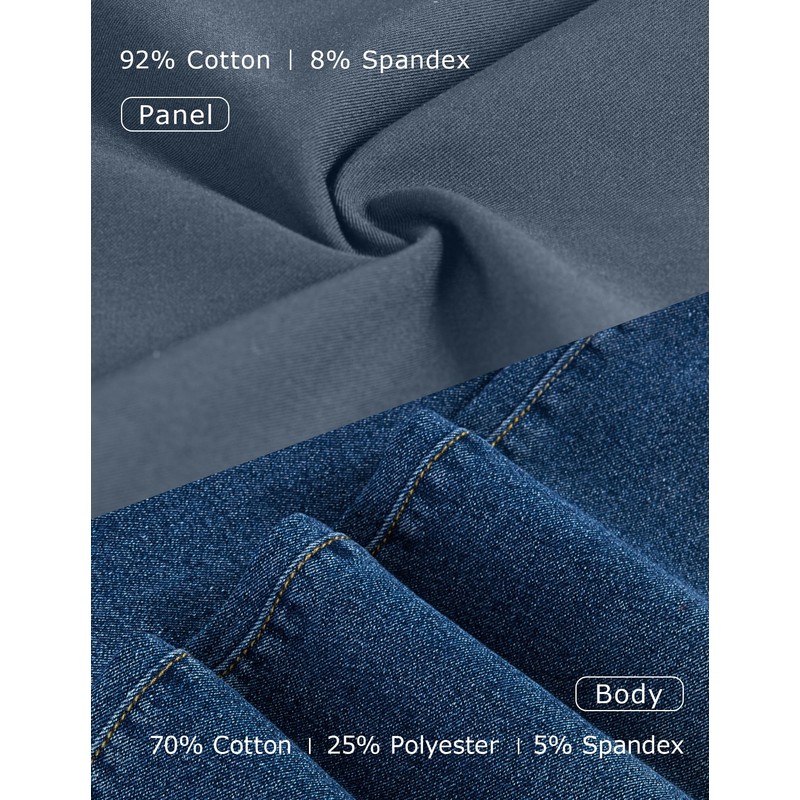 - SOFT AND STRETCHY MATERIAL: Body: 70% Cotton, 25% Polyester, and 5% Spandex. Panel: 92% Cotton, 8% Spandex. Comfy, durable medium-wash cotton denim with power stretch for cool and easy style.