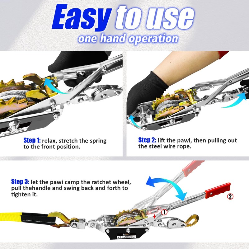 - 【Dual Gear Ratchet Puller】 The dual steel gears and locking pawls distribute the pulling force evenly, experience the convenience of one-handed operation with the powerful ratcheting cable come along pulling system. This puller gives you the capability to single handedly extract and pull the heavy loads with minimum strength.