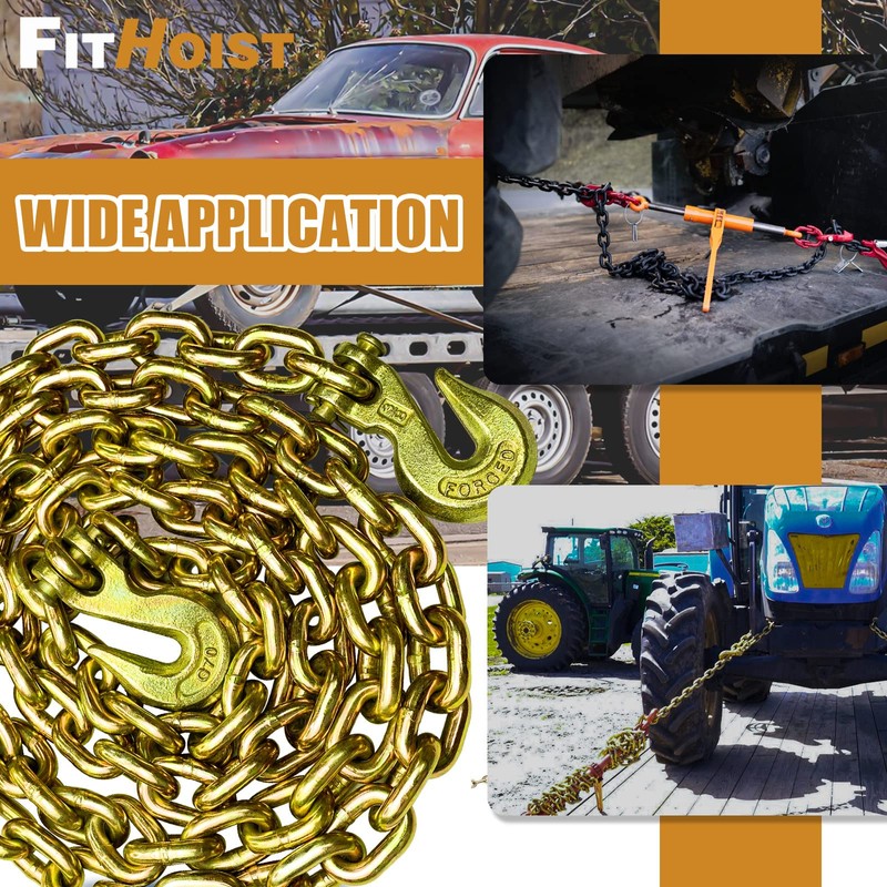 - 💪[ HEAVY DUTY CONSTRUCTION ] -- The high quality, standard link 3/8" size chain is heat-treated, and strength tested to ensure that the chain is not easy to break and operation more stable. Towing chain with clevis grab hooks fitted on each end to create a secure connection.