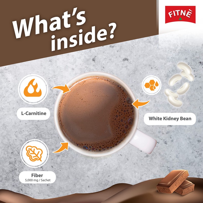 - FIBER 5,000 MG - FITNE choco has fiber to helps filling your stomach; promote regular excretory system; White Kidney Bean; lower carbohydrate to turn to sugar; decrease carb absorption; L-Glutathione improves skin health; helping you to have better radiant skin