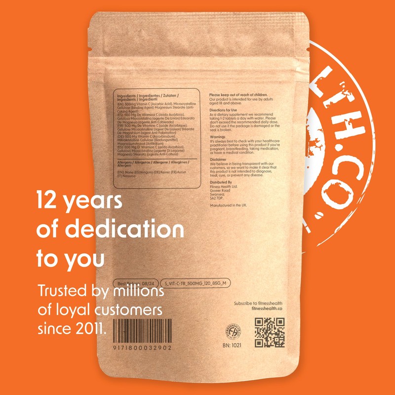 Fitness Health Vitamin C Tablets 500MG 120 Tablets - Supercharge The Immune System, Support Healthy Skin and Teeth - Pure vitamin C supplements - High Strength Ascorbic Acid - Vegan Food Supplements