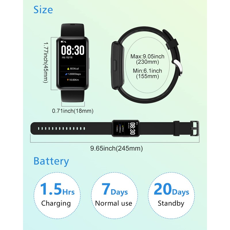 - ★ Fitness Tracker without Bluetooth/Smartphone- This fitness tracker can work independently without any App. You don't need to go hassle to download an app or connect it to your phone to get it started. It is very suitable for people who want a simple fitness tracker that can work without a cell phone. It is very light and comfortable, and it will be a great gift for parents and kids.