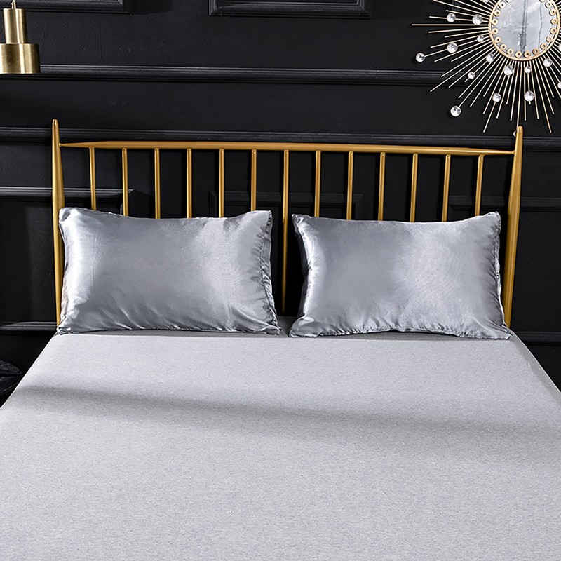 Fitted Sheet Plain Satin Shiny Bed Sheet 160 x 200 cm for Mattresses up to 35 cm Fitted Sheet Set 4-Piece with Bed Sheet, Fitted Sheet, 2 Pillowcases - Silver