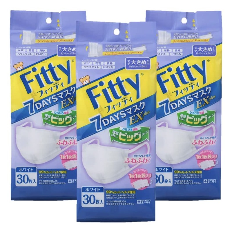 Fitty 7 Days Mask EX Plus Large, 30 Pieces, Fluffy Ear Elastics, White, Individually Wrapped