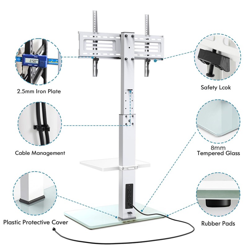 - Power Strip & Cable Management: FITUEYES floor TV stand is equipped with a power strip on the back with 3 AC outlets (125V/12A). No need to worry about the short wires. Careful cable management avoids the risk of tangled cables, give you a smooth line standing TV mount