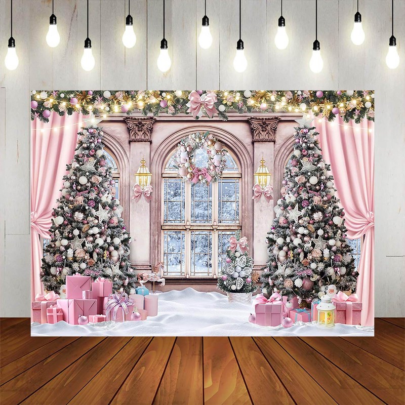 Fitumiw Christmas Backdrop for Photography 10x7ft Christmas Window Snowy Winter Scenery Photography Background Pink Curtain Snowy Forest Outside The Window Family Photo Shoot Booth Props