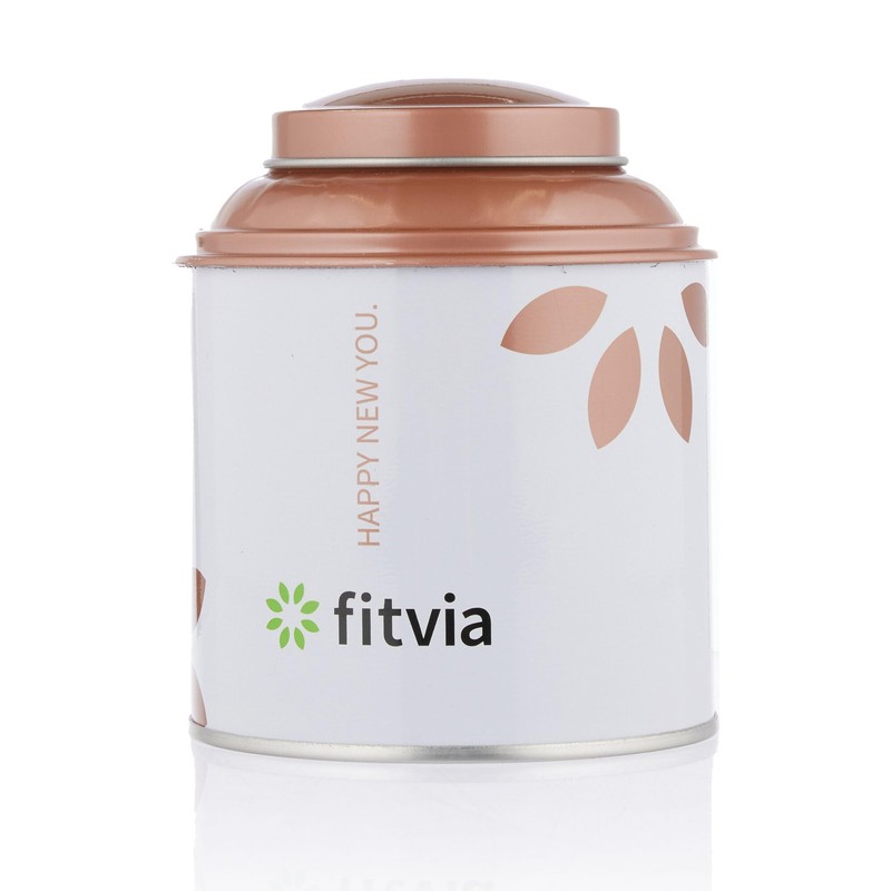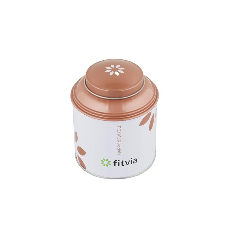Preserve the fresh, aromatic taste of your Fitvia tea with the high-quality fitvia storage tin. This stylish tin can hold up to 100 grams of tea, depending on the variety, and optimally protects your tea from moisture, light and other harmful influences thanks to its airtight seal. This preserves the full aroma of your tea and it stays fresh for a long time.