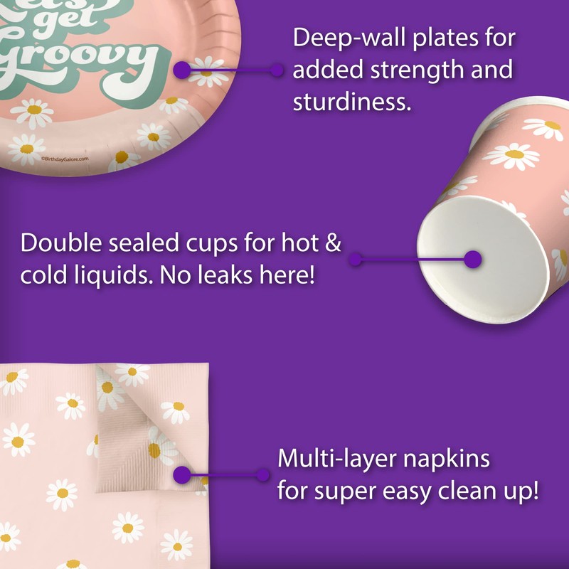 - Diseño prémium: nuestros suministros de fiesta Groovy son adecuados para fiestas de cumpleaños de niñas y niños, celebraciones de día festivo con tu familia y amigos, eventos especiales o simplemente para comidas diarias llenas de diversión, aperitivos y postres con picnics y cocinas. Shrieks of joy serán tu recompensa cuando utilices estos divertidos y únicos juegos de vajilla de fiesta.