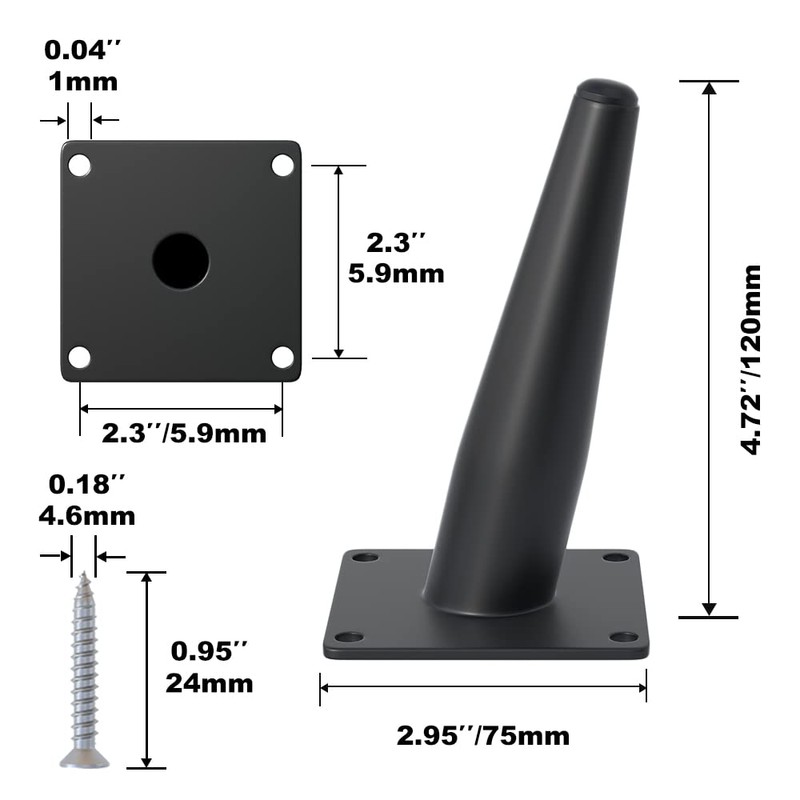 • 4 PCS Kit:4PCS 5 Inch Oblique Conical furniture legs, 16PCS Mounting screws. Total size is 2.95" x 2.95" x 5.12" / 7.5 x 7.5 x 13cm