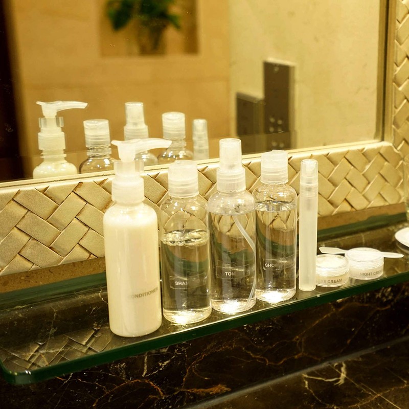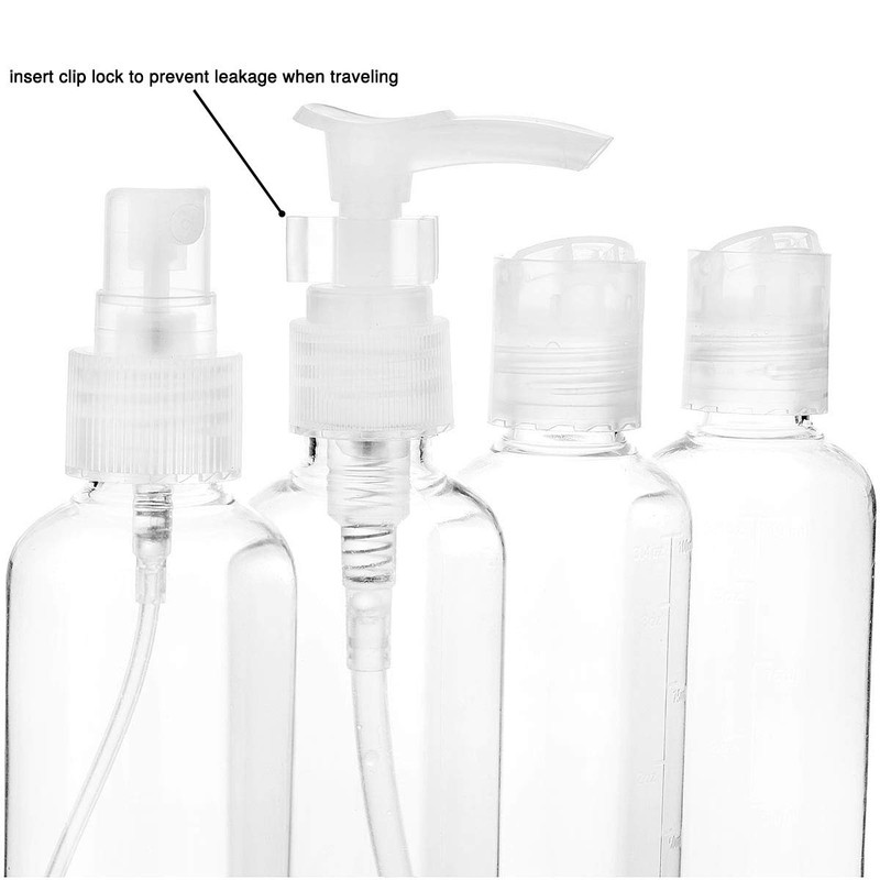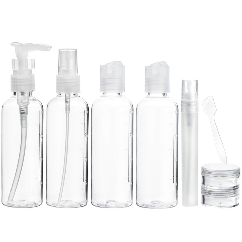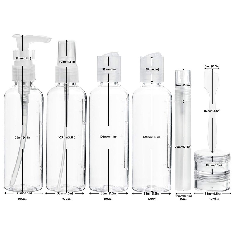 - WHAT’S INCLUDED IN TRAVEL KIT — Transparent bottles, 2 pieces 100ml dispenser bottles, 1 piece 100ml pump bottle (with safety lock), 1 piece 100ml spray bottle, 1 piece 10ml mini spray bottle atomiser for perfume or use as a face mist sprayer to keep your face hydrated during the flight, 2 piece 10ml clear cosmetic travel pots for cream, 1 piece spatula, 1 sheet of labels and 1 piece toiletry bag.