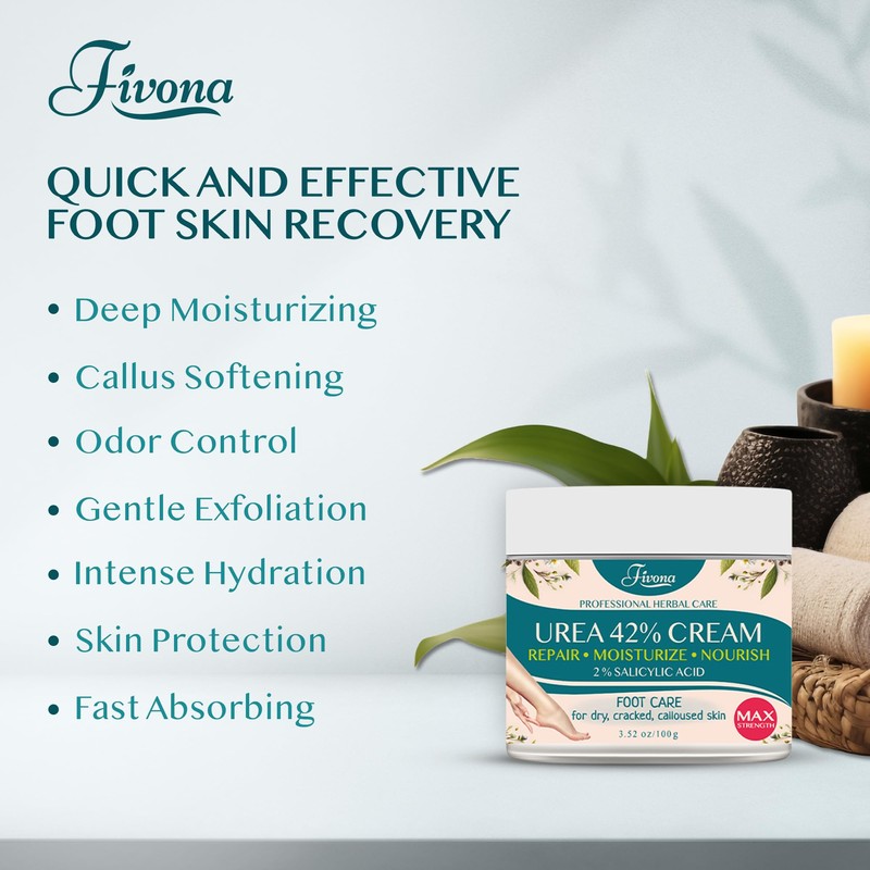- 42% Urea Foot Cream - Effectively repair your foot skin with our 42% Urea Foot Cream with 2% Salicylic Acid. Specially formulated to deeply moisturize and soften dry, cracked skin, this cream offers intense hydration for visibly smoother and healthier feet. Say goodbye to discomfort and hello to confidence as you pamper your feet with the nourishment they deserve.