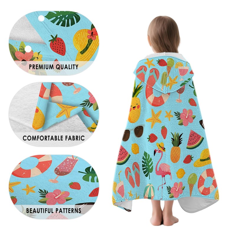 - 【Premium Material & Adorable Design】Crafted from high-quality fabric, this kids bath towels with hood features a charming summer design pattern, super soft, super absorbent, and durability