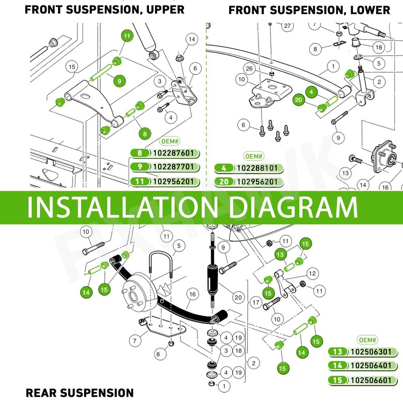 - 【FRONT SUSPENSION, UPPER】 8×Polyurethane Bushing (Gray), 2 inner and 2 outer polyurethane bushing, replacement of OEM#102956201, 102287701, and 102287601; 🏌 【FRONT SUSPENSION, LOWER】 4×Polyurethane Bushing (Gray) and 2×Spring Sleeve, replacement of OAM # 102956201 and 102288101; 🏌【REAR SUSPENSION】12 x Rubber Bushing (Black), 2 x Shackle Upper Sleeve, 4 x Spring Eye Mounts Sleeve, Replace OEM#102506601, 102506301, 102506401