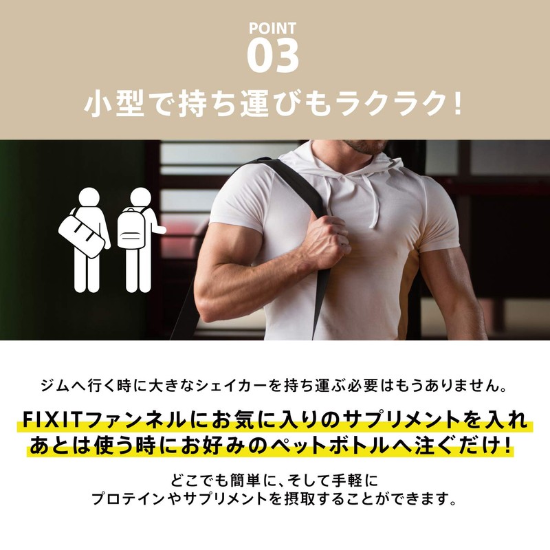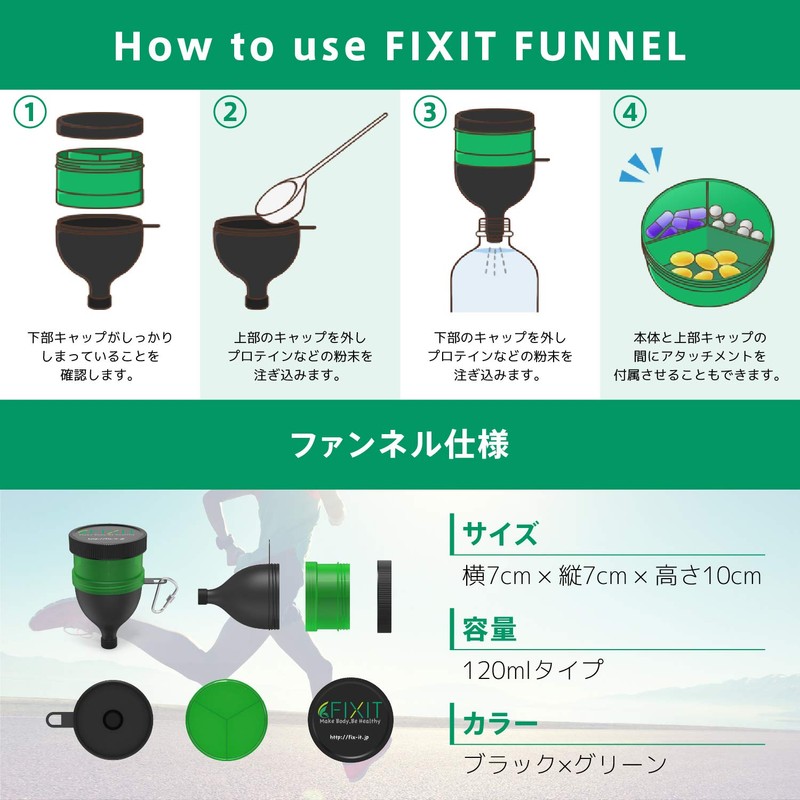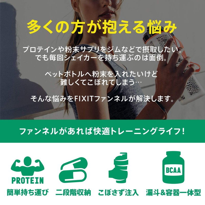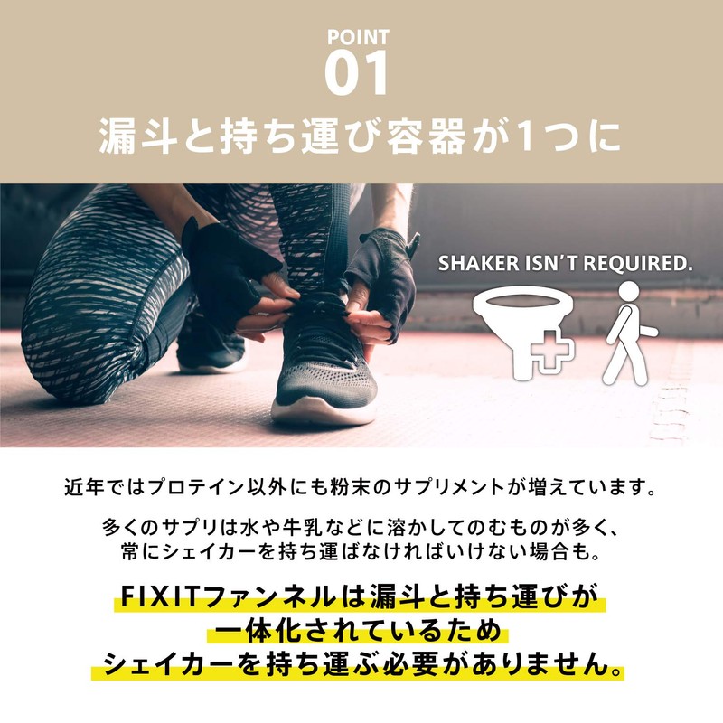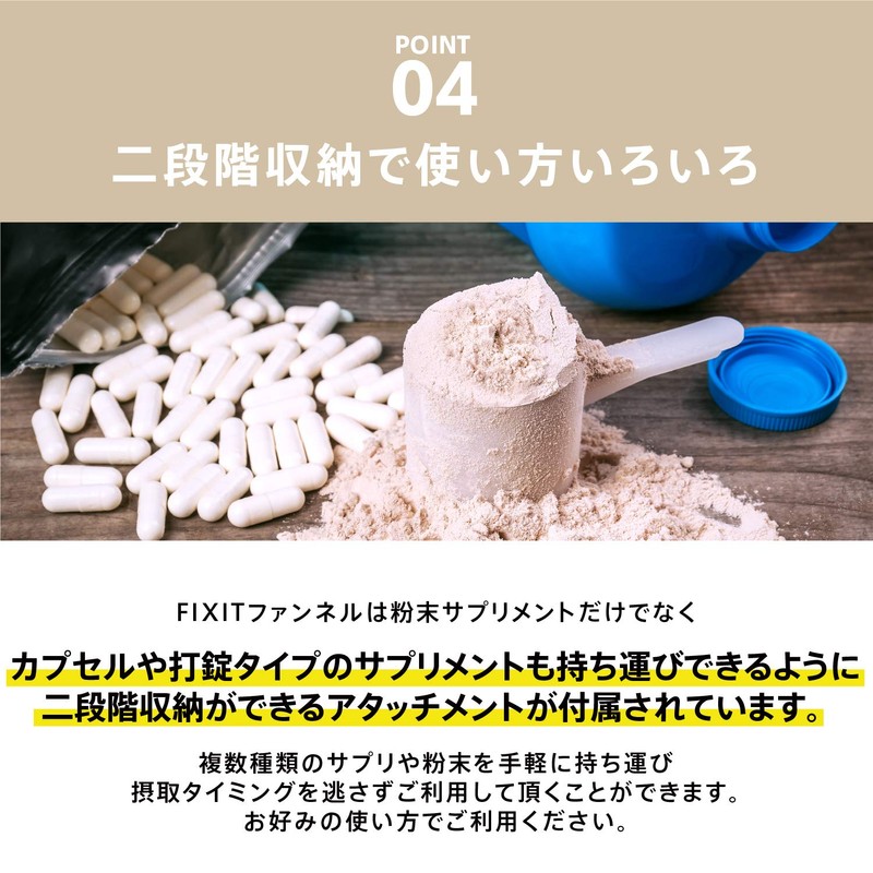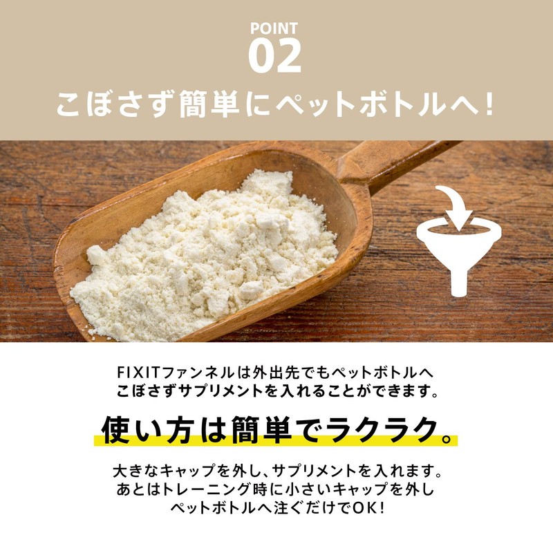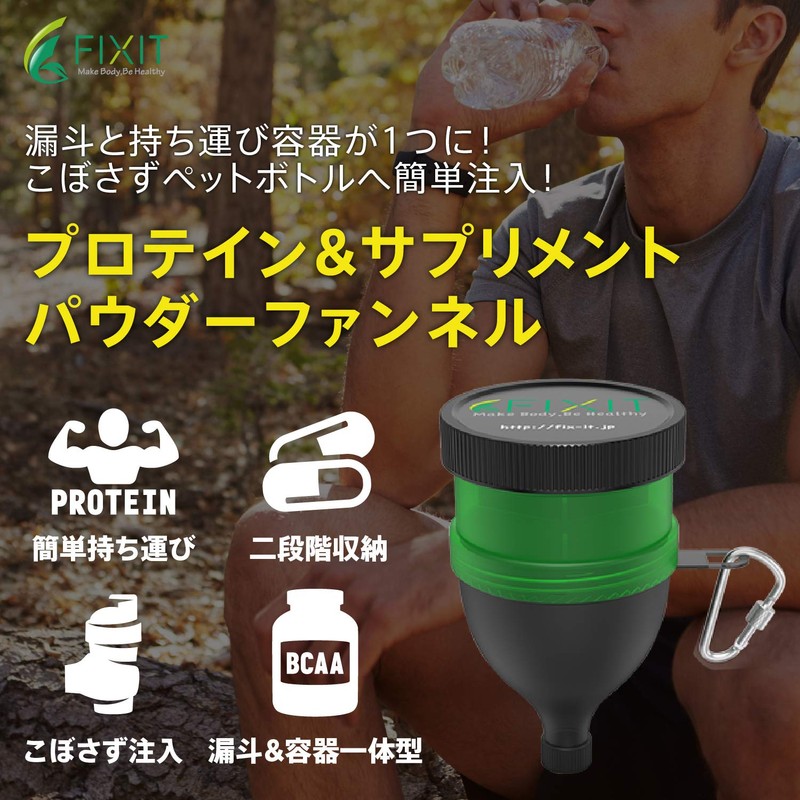 Funnel and carrying container in one! Easy to pour into plastic bottles without spilling! In recent years, powder supplements are increasing beyond protein. Many supplements melt in water, milk, and so on, you may need to always carry the shaker. The FIXIT Funnel is integrated with the funnel and carry, so you don't have to carry your shaker.