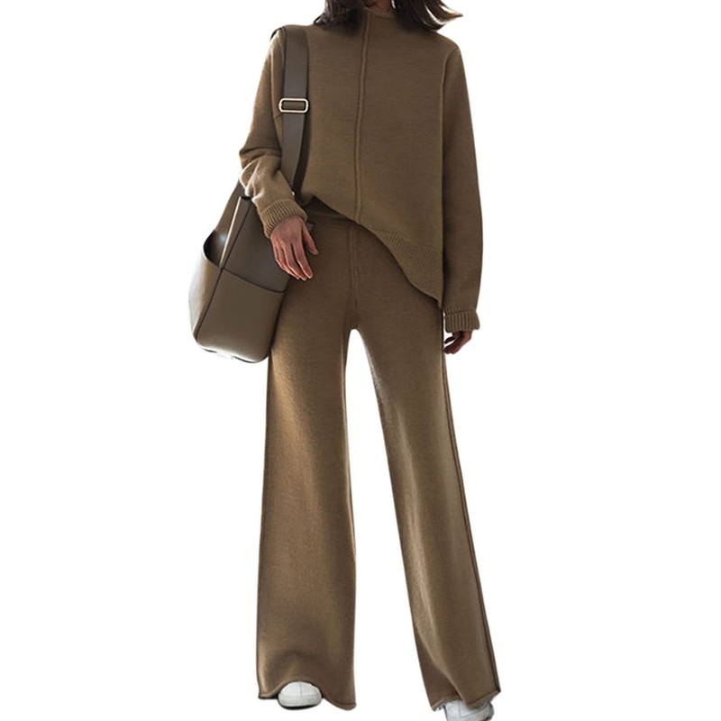 Fixmatti Women Knit Sweatsuit Turtleneck Sweater Top and Wide Leg Pant 2 Piece Outfits Brown L
