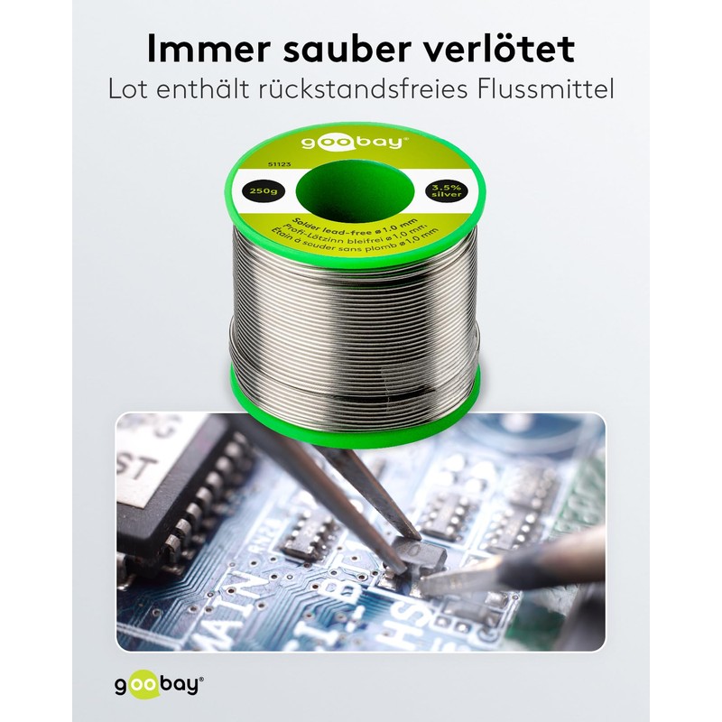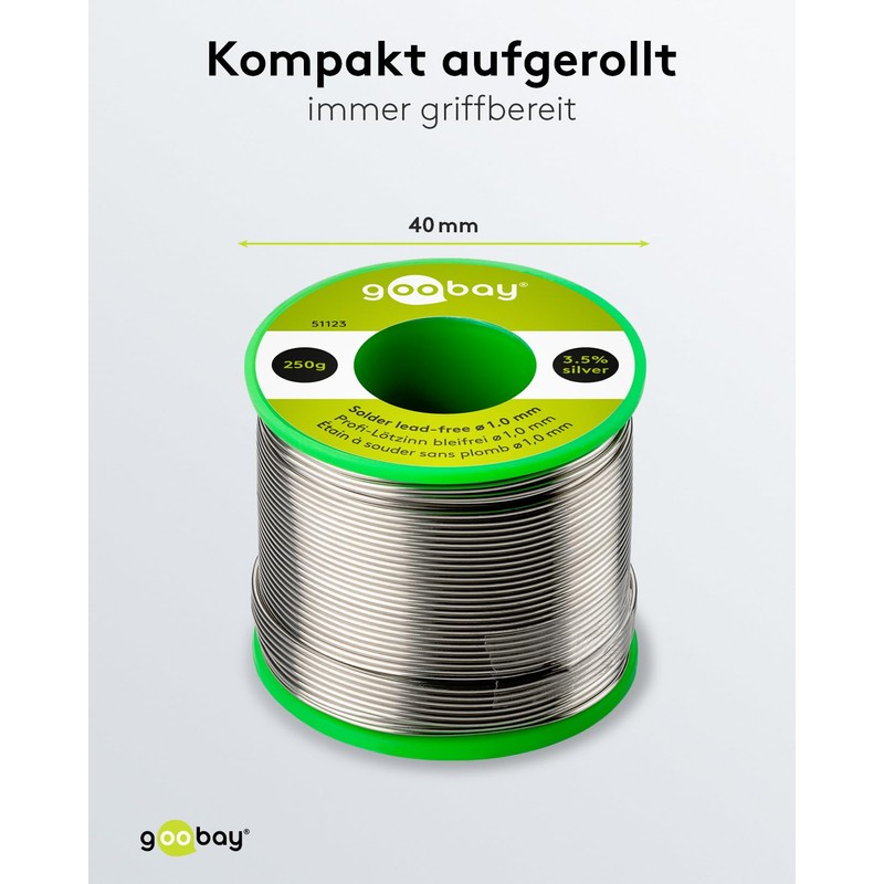 - Roll 250 g lead-free solder with 1 mm diameter; soldering material with 3.5% silver / 0.7% copper / 93.8% tin / 2.0% flux / 217°C melting point; silver solder is free from any halogens
