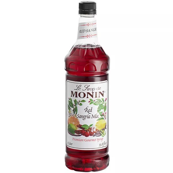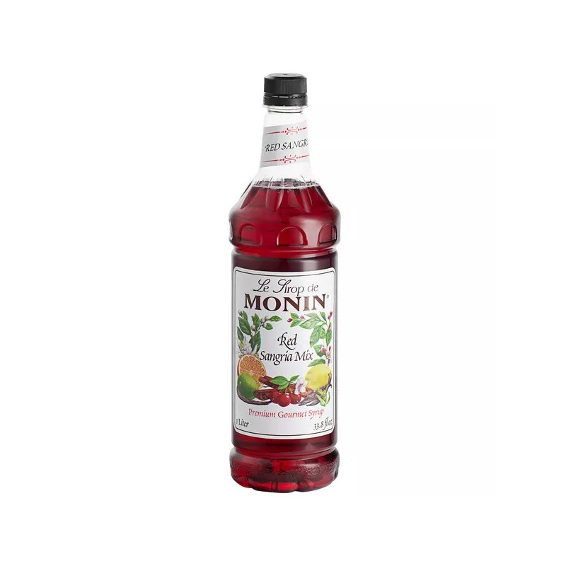 Skip the tedious task of preparing sangria with this Monin 1 liter premium red sangria mix! Featuring a spiced cherry taste with notes of citrus and a rich red color, this alcohol-free syrup allows you to simply add wine and brandy to create flavorful iced or frozen red sangrias. It can also be used to flavor iced teas and lemonades! Made with pure cane sugar, this syrup will enhance the flavor profile of your beverages without overpowering them or being too sweet. Packaged in a shatterproof bottle, this flavoring syrup boasts a sleek appearance for an attractive shelf presence and can easily be paired with a compatible pump for quick, efficient service during peak serving hours. Suggested Recipe: Spicy Mango Sangrita lime wedge or a fresh chili pepper for extra kick. Ice 0.5 oz. Monin spicy mango syrup 0.5 oz. Monin red sangria mix 1.5 oz. Reposado tequila 0.5 oz. Brandy 2 oz. Sweet and sour mix 0.5 oz. Fresh lime juice Fill a 14 oz. serving glass full of ice. Pour ingredients into mixing tin in order listed, then add ice from the serving glass. Cap the mixing tin, shake, and pour the contents back into the serving glass. Garnish as desired and serve! A Brand You Can Trust Since 1912, Monin has had a passion for delivering premium products that simplify the beverage-making process. A third generation family-owned company, Monin's uncompromising integrity to high quality ingredients has made it a proud leader in the industry today. Focusing on using premium ingredients and versatility in application when creating its products, Monin is constantly innovating and expanding its product portfolio with products that deliver new and exciting flavors, with equally enticing aromas, to the market. Offering everything from flavoring syrups, sauces, and concentrates to real fruit purees and complete smoothie mixes, deliver a statement of quality to your beverages when preparing with Monin's gourmet flavoring products. Specs Quantity 1/Each Shipping Weight 2.5 lb. Container Material Plastic Features BPA Free Dairy Free Gluten-Free Kosher Made in America Non-GMO Vegan Vegetarian Flavor Sangria Flavor Type Citrus Classic Fruits Mix Type Sangria Mixes Package Size 1 l. Package Type Bottles Sweetener Type Classic Type Drink Mixes