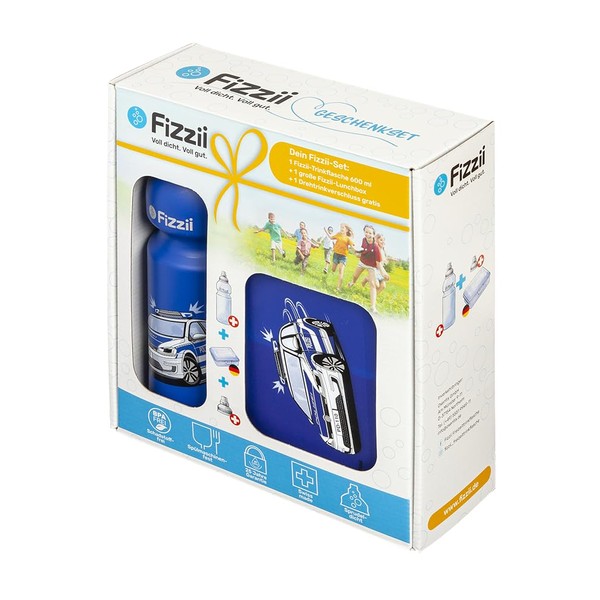 Great Gift Set/Lunch Set/Set for Nursery and School: Leak-proof 600ml Fizzii Water Bottle with matching lunch box and a spare twist cap. The bottle is really tight even with sparkling drinks - there is a 25 year guarantee. The large lunch box has a removable divider tray for fruit and vegetables. The additional twist cap is suitable as a replacement. The set comes in a high-quality gift box and is therefore a beautiful gift for birthdays, school enrolment, Christmas or any other occasion
