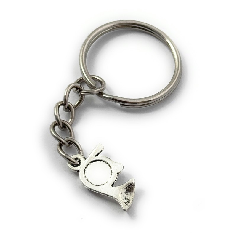 • A tiny french horn charm with detail on one side (12 x 17 mm) hung on a silver tone keyring (25mm diameter, chain length 30mm)