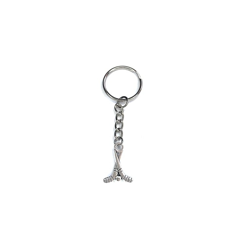 - Small silver tone hockey sticks and ball charm (21 x 16 mm) hung on a silver tone keyring (25mm diameter, chain length 30mm)
