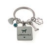 - Stainless steel Labradoodle charm with text on one side (20 x 23 mm), a small stainless steel bone charm (6 x 14 mm), a stainless steel paw charm (12 x 13 mm), a stainless steel heart charm (9 x 9 mm) and a turquoise rhinestone with stainless steel casing (6 x 5 mm) hung on a stainless steel keyring (29 mm diameter)