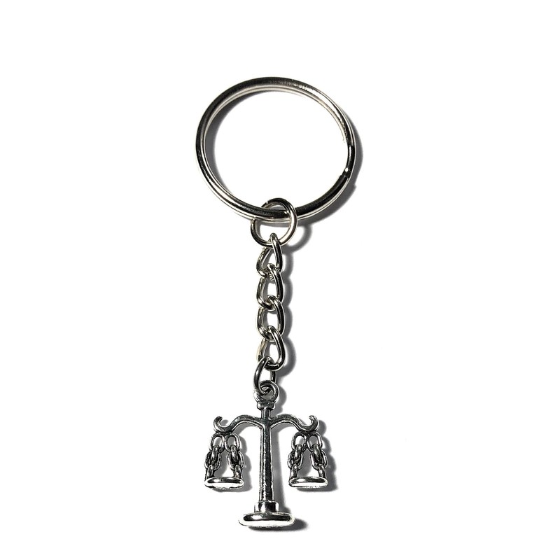 A silver tone keyring hung with a silver tone scales of justice charm.