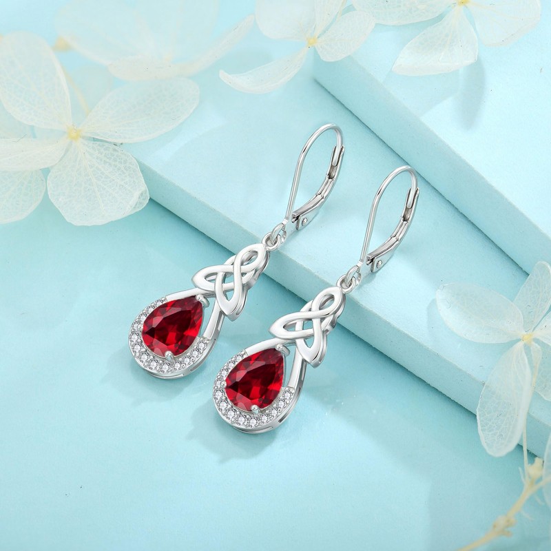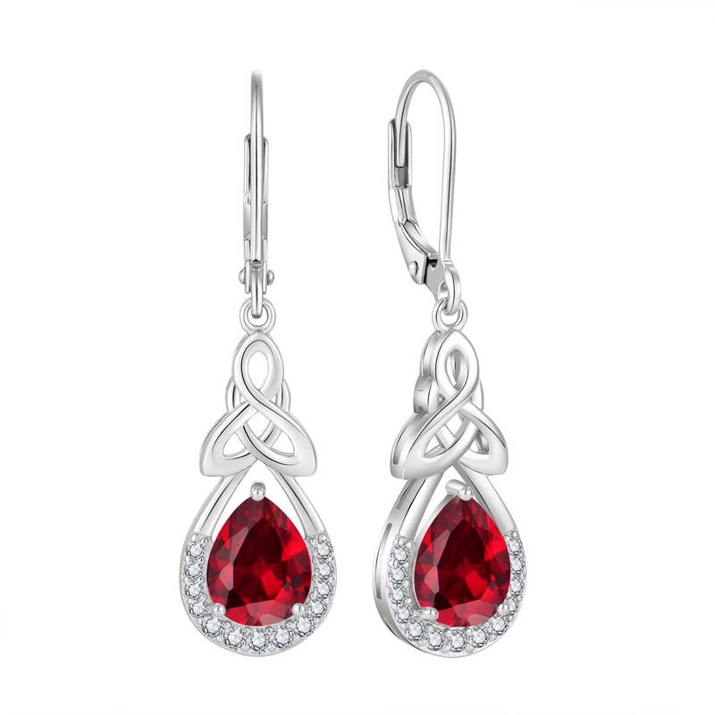 FJ Celtic Knot Dangle Drop Leverback Earrings 925 Sterling Silver Infinity Teardrop Earrings Ruby July Earrings Irish Good Luck Jewellery for Women