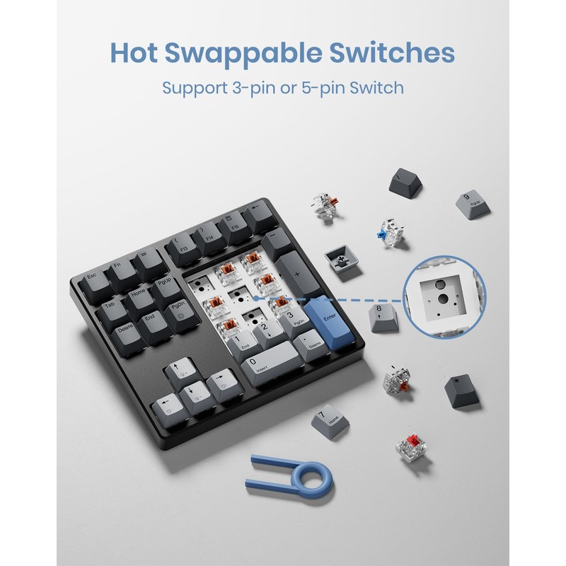 - 【Hot Swappable& Noise Reduction Structures】Our numpad support 3/5 pin switch, the switches are individually removable and can be replaced without soldering issue. Furthermore, the number pad is designed noise reduction structures with poron foams, silicon switch pad and the bottom sound absorbing foam. Perfect creamy sound and not too clicky let the keypad itself feels great under the hand like typing on a cloud.