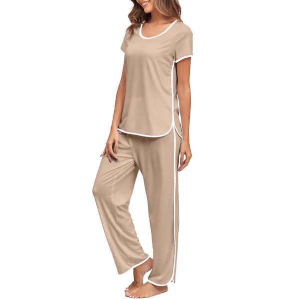 FKEEP Stripe Pajamas Set Women Two-Piece Nightwear Short Sleeve Sleepwear Soft Side Split Loungewear Pjs Sets(Solid Coffee,X-Large)
