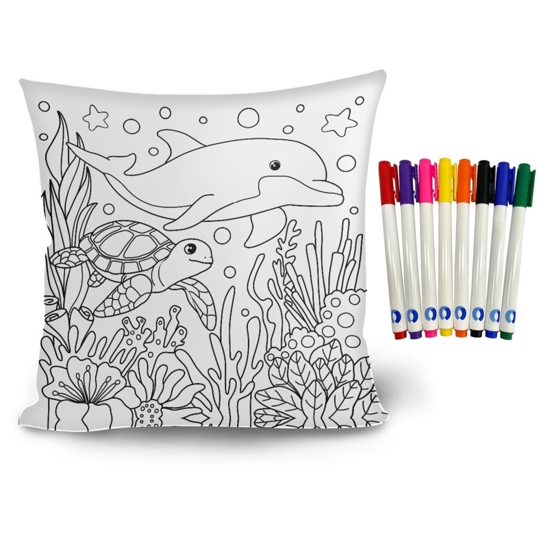 Fkwergsy Coloring Kids Pillowcase - Dolphin Turtle Pillow Cover with 8 Colour Fabric Markers - Soft Polyester Fabric Arts Crafts Pillow Case