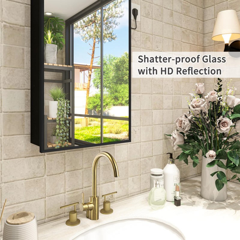- 【Safety & HD Reflections】: Our copper free glass mirror is protected by a aluminium alloy frame, and the mirror on the medicine cabinet ensures seismic resistance and provides distortion free high-definition reflection. The slim contour also enhances the mirror experience, providing a wide and charming view. Provide you with a better user experience.