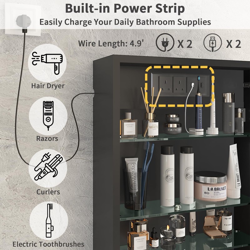 - 【Unique Build-in Power Strip】: Our mirror cabinet has added a unique power strip design,equipped with 2 AC outlets and 2 USB-A ports,allowing you to easily charge your daily bathroom supplies, such as hair dryers, razors, curlers, electric toothbrushes, etc.The length of the wires is 1.5 meters, and we have also added hidden wire slots on both sides, which will not affect the aesthetics.